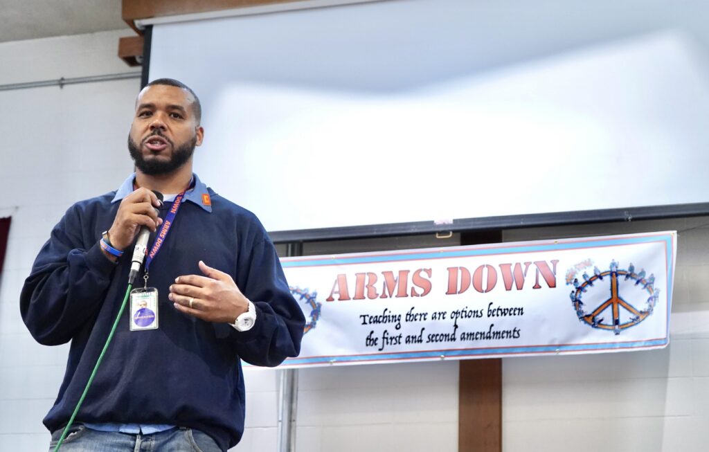 “If anybody in here thinks it’s cool to call home and hear a family member went to prison for a gun, raise your hand,” Hunter said at the inaugural Arms Down gathering in 2024. Not a single hand went up. “That’s what I thought.”
