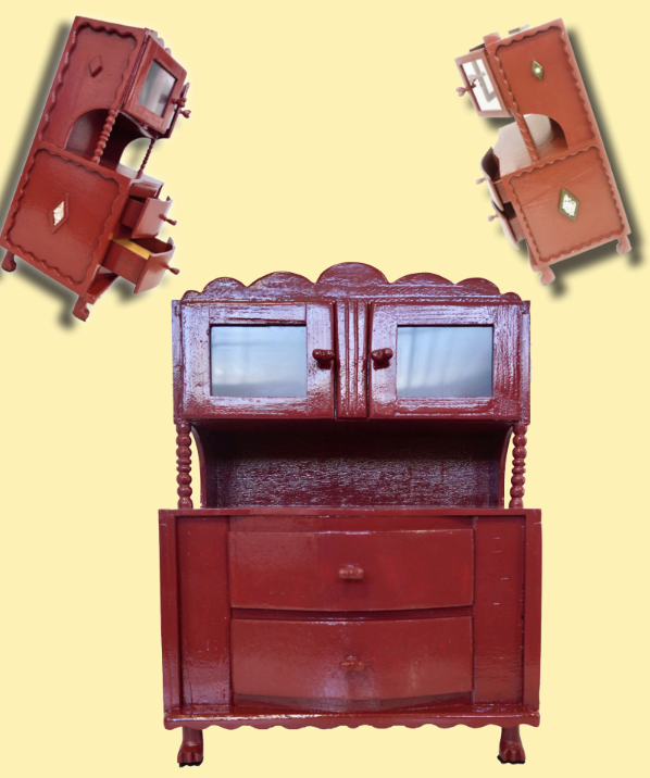 One of the cabinets, about two feet high and a foot wide, he painted red. It has two compartments near the top and two drawers on the bottom for storage of jewelry. The contents of the upper compartments are visible through pieces the artist cut from discarded TV screens. The compartments open and close, with durable hinges devised from cloth and cardboard. The door handles lock with a twist. It took Valdivia about a month to complete this project.