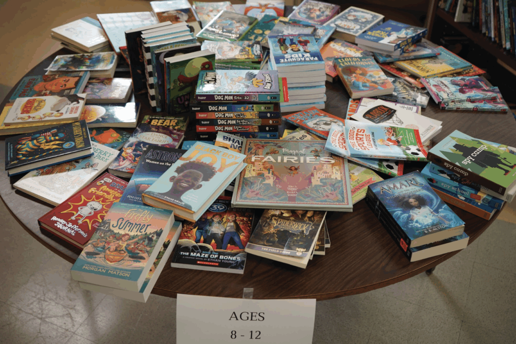 The categories Board Books, Español, Graphic Novels, Sports Books, Picture Books, Science Books, Gift Books, and Activity Books hung from the walls and tables defining the type of books on that table. Other tables labeled 2–7, 8–11, and 12–15 pointed to age specific books.